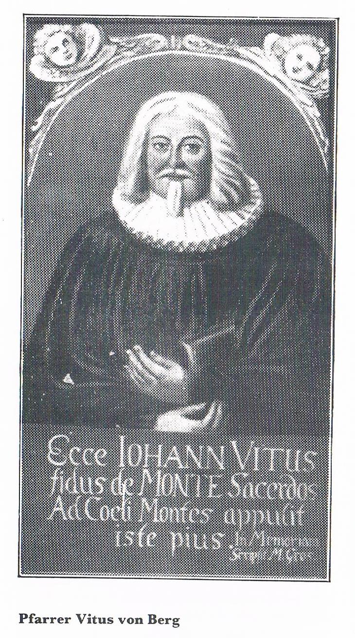 Pfarrer Veit vom Berg (1612 - 1675) soll aus einem altadeligen Geschlecht in der Nähe von Zirndorf stammen. Er besuchte die Lateinschule in Neustadt/Aisch, wurde im Dreißigjährigen Krieg 1632 als 20jähriger von Kroaten gefangengenommen und mißhandelt. Ihm gelang die Flucht nach Windsheim, von wo ihn Hunger und die Angst vor der Pest über Kitzingen nach Würzburg trieben. In Erfurt studierte er Theologie, kam aber dann in seine fränkische Heimat zurück und wurde 1640 als Pfarrer von „Oberhöchstadt“ und Steppach ordiniert. Da zu der Zeit kaum eine Pfarrei einen Geistlichen hatten, reichte sein Wirkungsbereich von Uehlfeld über Dachsbach, Emskirchen, Kirchfembach, Kairlindach bis nach Münchaurach und stand so immer wieder auch auf der Kanzel und am Altar der Kirche in Oberreichenbach. Diese Aufgabe war nur unter Lebensgefahr möglich. Einst rettete ihn sein Tagebuch vor dem Tode, in dem eine Kugel stecken blieb. Er schreckte auch nicht zurück, wenn er zu Pestkranken gerufen wurde. So wurde er zwischen Aisch und Aurach zu einem angesehenen und geachteten Mann. Ab 1648 wurde er Pfarrer von Uehlfeld. Dort verstarb er nach einer langen, aufopferungsvollen Tätigkeit im Jahre 1675.
